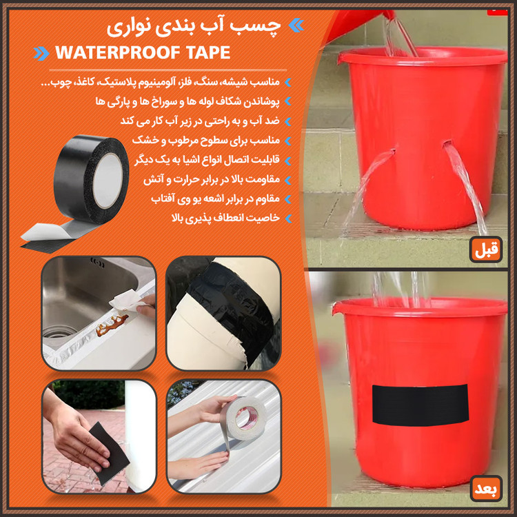 چسب آب بندی نواری نمونه ای جدید از ابزار پوشش محسوب می شود که دارای سطح رویین شبکه ای به رنگ مشکی می باشد ، خصوصیتی که زیبایی ظاهری را برای آن تا حدی پدید آورده ، به طوری که بتوان از کالا در بیشتر موقعیت های مکانی بدون نگرانی از تخریب شکل ظاهری استفاده نمود . سطح زیرین محصول ، لایه ای چسبی وجود دارد که چسبندگی بسیار خوبی را دارا است ، به طوری که به اغلب سطوح می توان آن را چسباند و استفاده کرد ، البته با دقت به این موضوع که بهترین عملکرد برای کالا روی سطح یکدست (مسطح) ، بدون برجستگی است . پهنای چسب درزگیر ، 5 سانتی متر با طول 5 متر می باشد که می توانید از آن برای پوشش ترک سطوح مختلف استفاده کنید ، کافی است سطح مورد نظر را تمیز کنید و در نهایت برچسب را روی منافذ ، ترک و یا شیار مورد نظر به خوبی بچسبانید به طوری که کامل آن پوشش دهد . برچسب آب بندی ، مقاومت لازم در برابر آب را نیز دارد بنابراین کمترین محدودیت ممکن در استفاده از آن را خواهید داشت .