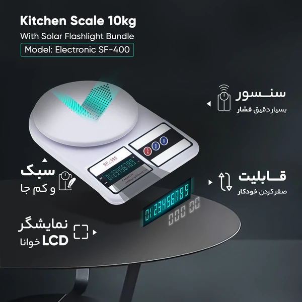 ترازو دیجیتال آشپزخانه مدل SF-400 ظرفیت 10 کیلوگرم (اصل) همراه با باتری و چراغ دار